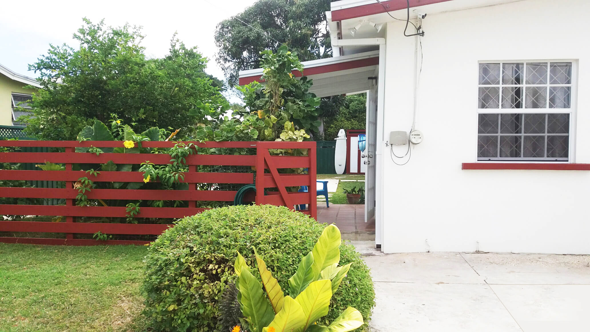 One of two vacation rentals which share a pretty tropical garden and small cool-off plunge pool. Located in South Point, Atlantic Shores, the apartments are adjoined to a private gated residential property; you have your own private patio and entrance. Fully equipped one bedroom suite with combined cozy TV/lounge area: King-Size bed, self catering kitchen/diner and ensuite bathroom. Simple, clean and modern, bright and breezy with all mod-cons: WIFI, A/C, TV. Walking distance to surfing, a short drive to the beach. (Car Hire Advised).